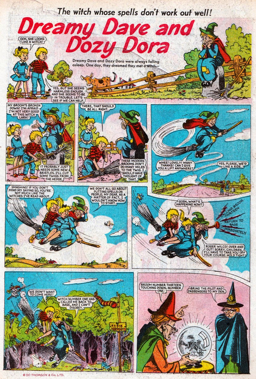 The centre pages featured another adventure with Dreamy Dave and Dozy Dora with artwork by George Ramsbottom. (Thanks to Ray Moore for that info.) One of the weirdest things about this strip was that every week the sleepy siblings shared the same dream!